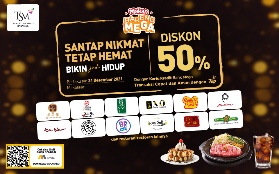 6. Tidak dapat digabungkan dengan promo lainnya. 7. Berlaku untuk seluruh kartu kredit Bank Mega kecuali Mega Groserindo Card, Mega Corporate Card dan Mega Wholesale Card. 8. Merchant penerima diskon kartu kredit Bank Mega berada di Trans Studio Mall, Trans Park Mall di seluruh Indonesia.