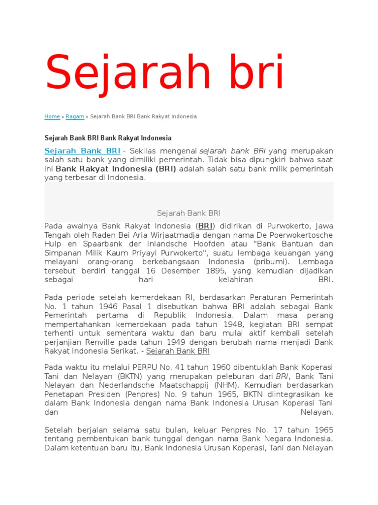 Sejarah bank bri dan produknya bank bri merupakan bank yang tersebar luas di berbagai wilayah di indonesia. Bank rakyat indonesia mungkin dibilang bank tertua karena telah berdiri sebelum indonesia merdeka sekitar tahun 1895. Bri juga sempat menjadi bank sentral melalui peraturan uu no.