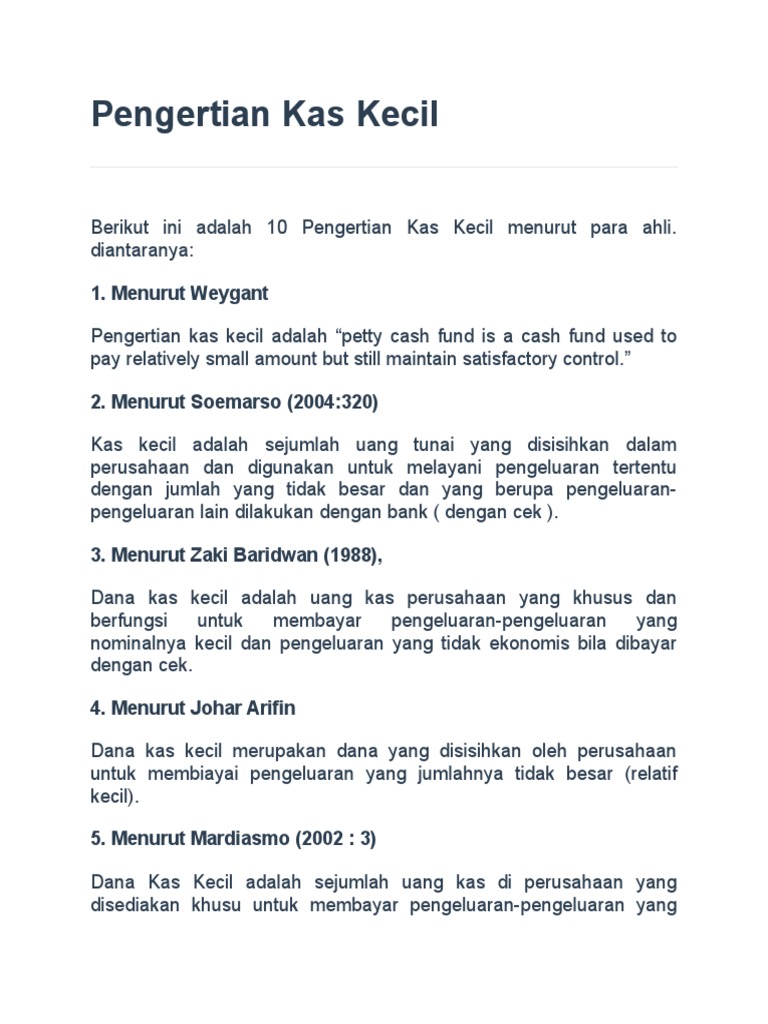 1. Menurut Weygant. Pengertian kas kecil adalah "petty cash fund is a cash fund used to pay relatively small amount but still maintain satisfactory control." 2. Menurut Soemarso (2004:320) Kas kecil adalah sejumlah uang tunai yang disisihkan dalam perusahaan dan digunakan untuk melayani pengeluaran tertentu dengan jumlah yang tidak besar dan yang berupa pengeluaran-pengeluaran lain ...
