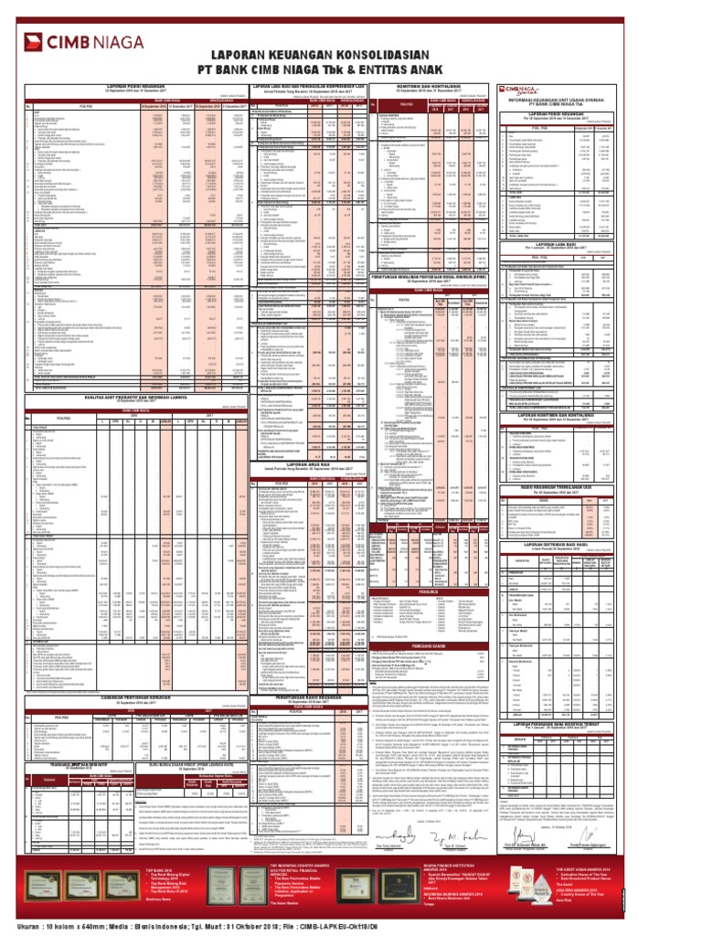 Laporan Informasi atau Fakta Material Iklan Pemberitahuan Pendapatan Bagi Hasil Ke-7 Sukuk Mudharabah I Bank CIMB Niaga Tahap III 2020 Seri B & C. Berita 20 Des 2021. Laporan Rasio Pengungkit Desember 2021 (Individu) Laporan Keuangan 31 Des 2021. Laporan Rasio Pengungkit Desember 2021 (Konsolidasi) Year, PDF. List of Report. Annual Report 2019, PDF version 24.99 MB. Annual Report 2018, PDF version 168.32 MB. Annual Report 2017, PDF version ... Laporan keuangan Bank Niaga 2008. Download softcopy (PDF) laporan keuangan (financial statement) Bank CIMB Niaga Tbk. Analisis Rasio Laporan Keuangan Bank CIMB Niaga terhadap Camels. Nilai Rasio CAMEL dihitung dengan 7 indikator, yaitu: a. CAR. Dirumuskan : CAR = Total Modal / Total ATMR. Pada laporan tersebut CAR mengalami perubahan yang signifikan tiap tahunnya, pada tahun 2007 rasio CAR besar (18,44), namun pada tahun 2008 dan 2009 mengalami penurunan (15 ...
