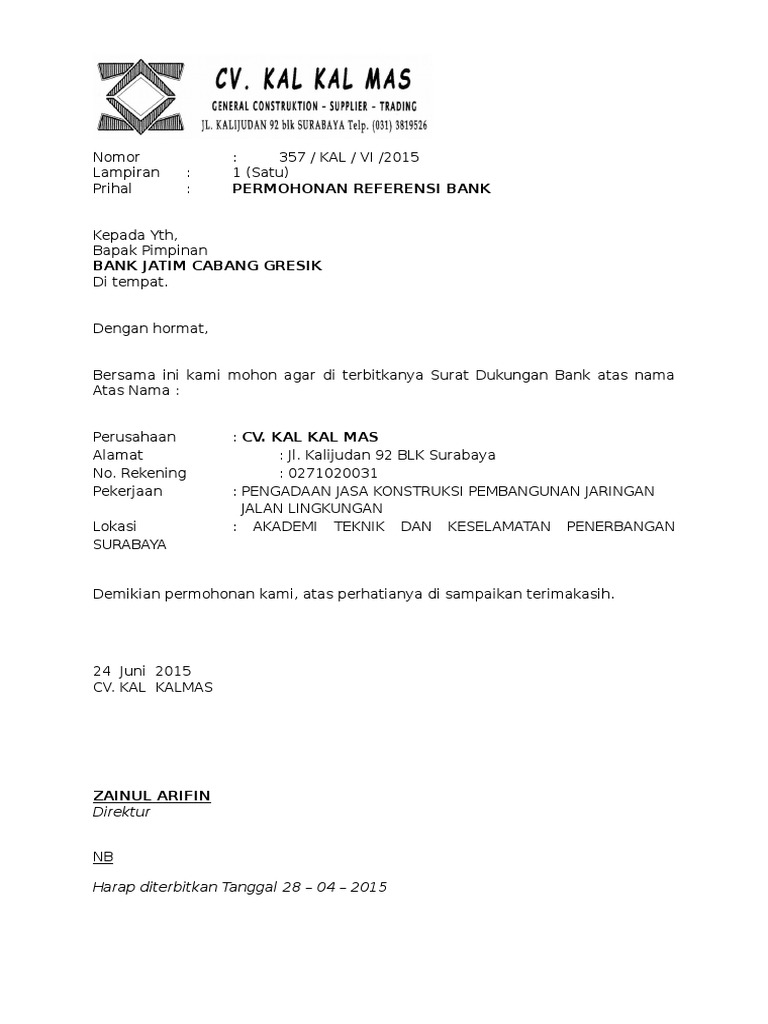 Jun 16, 2016 · SURAT REFERENSI BANK diperlukan untuk melengkapi dokumen saat kita ditunjuk atau ditetapkan sebagai pemenang lelang, atau saat ingin mendaftar sebagai vendor atau rekanan ke sebuah perusahaan biasanya harus dilengkapi dengan Surat Referensi Bank yang dikeluarkan oleh Pihak Bank dimana nomor rekening kita tercantum.