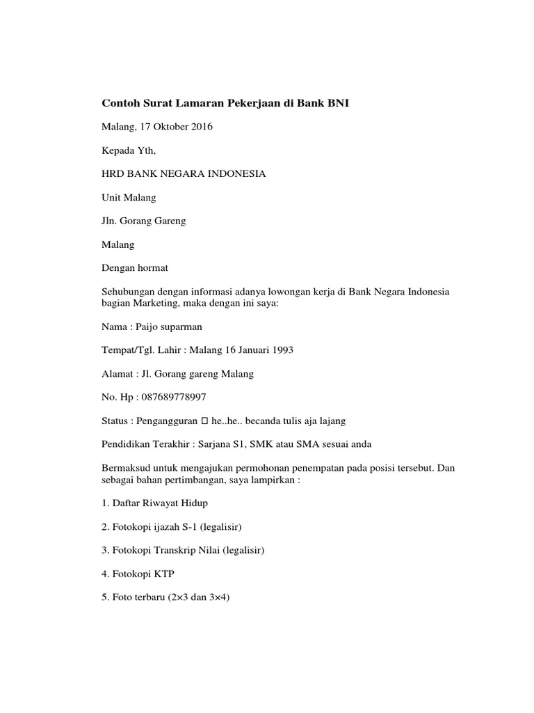 Teks penuh. (1). Makassar, ... Kepada : Yth. Staf HRD. PT Bank Negara Indonesia ( BNI ) Di. Jl. Contoh Surat No. 23 Makassar Perihal : Lamaran Kerja.