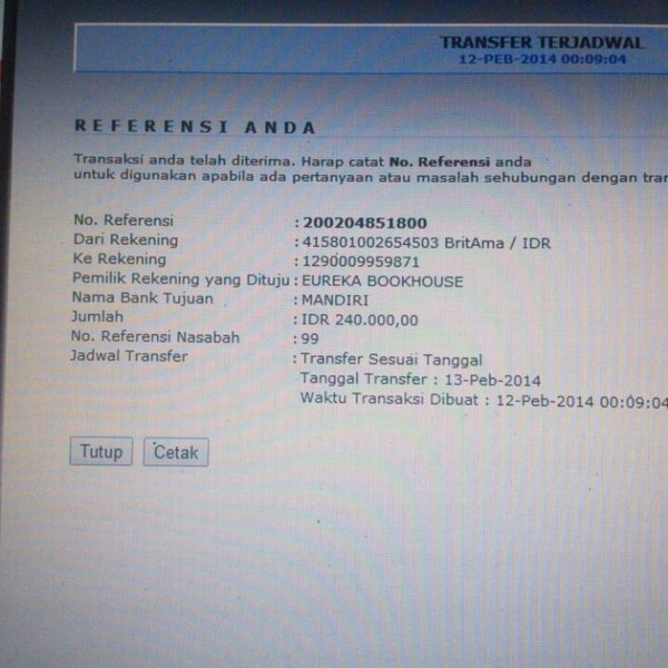 No referensi bank mandiri. pada pembiayaan murābaḥah di Bank Syariah Mandiri Purwokerto. Dengan rumusan masalah bagaimana metode perhitungan margin pembiayaan murābaḥah di Bank Syariah Mandiri Purwokerto. Penelitian ini merupakan penelitian lapangan yang dilakukan di Bank Syariah Mandiri Purwokerto untuk menggali data-data yang relevan atau sumber data. Pelayanan bank secara digital seperti Mandiri SMS memang bukan hal baru. Namun, tentu masih ada nasabah yang belum mengetahui cara cek saldo Mandiri SMS . Untuk itu, tulisan ini akan membahas cara memeriksa saldo bank Mandiri melalui SMS dan cara registrasinya, menurut laman resmi Bank Mandiri. Head Office : International Financial Centre 2, Lt.19 Jl. Jend Sudirman Kav. 22-23 Jakarta, 12920. Operating Office : Gedung Prima Sejahtera (GPS) Jl. Jalur Sutera Kav. 5A Tangerang, Banten 15144 Format Contoh Surat Perintah Transfer Uang yang Benar 2019. Contoh Surat Perintah Transfer Uang have an image from the other.Contoh Surat Perintah Transfer Uang It also will include a picture of a kind that could be observed in the gallery of Contoh Surat Perintah Transfer Uang. The collection that comprising chosen picture and the best amongst others.
