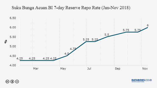 Saat ini, suku bunga Bank Indonesia sebesar 6%, level itu sudah bertahan selama 7 bulan terakhir. Bank sentral mulai menaikkan suku bunga sejak 17 Mei 2019, saat itu suku bunga dinaikkan dari 4,25% menjadi 4,5%. Bank Indonesia bakal mengadakan Rapat Dewan Gubernur Bulanan pada 19 juni 2019-20 Juni 2019.