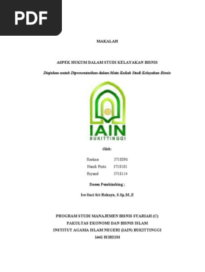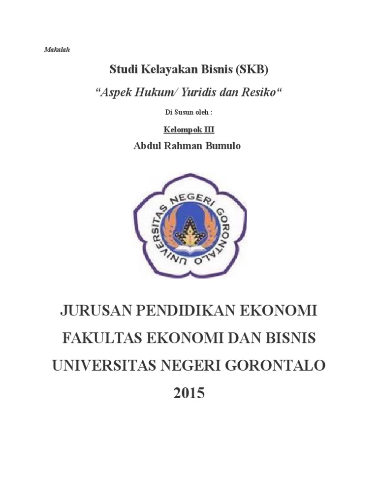 MAKALAH KEL. 5 SKB.doc - MAKALAH ASPEK HUKUM DAN LEGALITAS ... Aspek hukum merupakan aspek yang pertama kali harus dikaji dalam studi kelayakan bisnis. Hal ini karena jika berdasarkan analisis pada aspek hukum sebuah ide bisnis sudah tidak layak maka proses tersebut tidak perlu diteruskan dengan analisis pada aspek-aspek yang lain. Contoh Makalah Studi Kelayakan Bisnis Aspek Ekonomi ... Contoh Makalah Studi Kelayakan Bisnis Aspek Ekonomi. 3.1 Kesimpulan 3.2 Saran BAB I PENDAHULUAN Studi kelayakan sangat diperlukan oleh banyak kalangan, khususnya terutama bagi para investor yang selaku pemrakarsa, bank selaku pemberi kredit, dan pemerintah yang memberikan fasilitas tata peraturan hukum dan perundang-undangan, yang tentunya ... Contoh Makalah Studi Kelayakan Bisnis - Makalah 3 aspek ... 1. siapa pelaksana bisnis. 2. bagaimana jadwal penyelesaian bisnis. 3. siapa yang melakukan studi masing-masing aspek bisnis. Manajemen dalam operasi. 1. bentuk organisasi/badan usaha yang dipilih 2. struktur organisasi. 3. deskripsi masing-masing jabatan 4. jumlah tenaga kerja yang digunakan. 5. siapa-siapa anggota direksi dan tenaga-tenaga kunci.