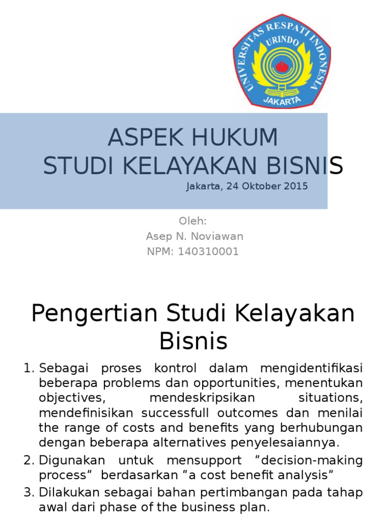 Makalah aspek hukum dalam studi kelayakan bisnis. Faktor Lingkungan Perusahaan: Pengertian, Macam ... - Kelas IPS Lingkungan Hukum; Kegiatan perusahaan berada di dalam suatu kerangka hukum, sehingga faktor hukum ini mempengaruhi keputusan-keputusan serta transaksi-transaksi dalam peusahaan. Manajer perusahaan harus mengambil kebijaksanaan yang tidak bertentangan dengan hukum yang berlaku. Aspek Ekonomi dan Sosial | Makalah Kondang Adapun tujuan dari pembuatan makalah ini adalah sebagai berikut : 1. Untuk mengetahui pengertian dari aspek sosial ekonomi dalam Studi Kelayakan Bisnis. 2. Untuk mengetahui dampak aspek sosial ekonomi dalam Studi Kelayakan Bisnis. 3. Untuk mengetahui bagaimana pendapatan peningkatan Nasional. Aspek Hukum dan Manajemen (SKB) | anggih91 Aspek Hukum dan Manajemen (SKB) Studi kelayakan bisnis merupakan analisa suatu usaha/bisnis apakah layak atau tidak untuk dijalankan. Agar usaha yang ingin dijalankan tersebut sesuai dengan yang direncanakan dan layak untuk dijalankan maka diperlukanlah studi kelayakan bisnis ini. Penilaian Kinerja - Pengertian, Tujuan, Manfaat, Proses, Metode Feb 07, 2022 · Dalam beberapa kasus , para manejer mengendalikan hampir semua aspek proses penilaian dan dengan demikian berada dalam posisi yang bisa memanipulasi sistem. Sebagai contoh, seorang atasan mungkin ingin memberikan kenaikan bayaran kepada karyawan tertentu.