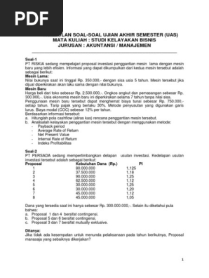 Soal Dan Jawaban Studi Kelayakan Bisnis Soal Dan Jawaban Studi Kelayakan Bisnis Juli 14, 2020 Dapatkan link; Facebook; Twitter; Pinterest; Email; Aplikasi Lainnya; UJIAN AKHIR SEMESTER (UAS) GENAP. TAHUN AKADEMIK 2019/2020. Mata Kuliah : Studi Kelayakan Bisnis. Hari/Tanggal : Senin-Selasa, 13-14 Juli 2020. Fakultas/Prodi : Ekonomi/Manajemen S1.