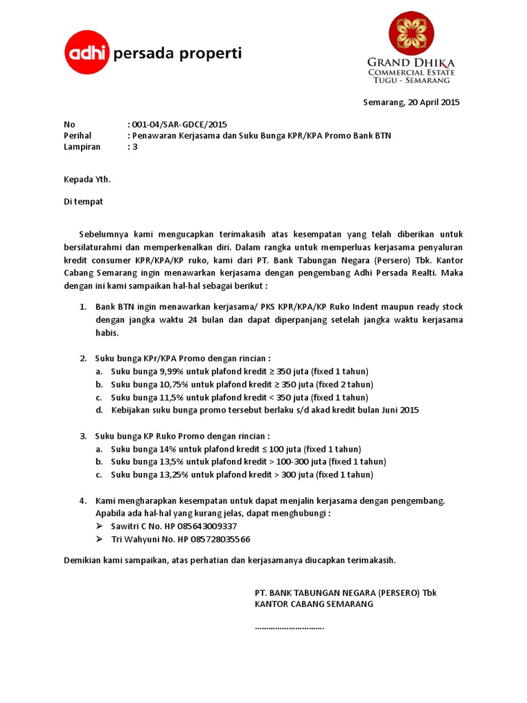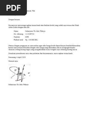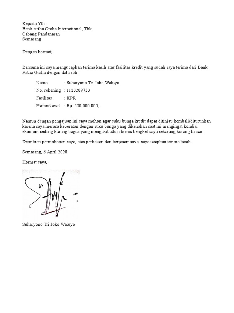 Contoh surat permohonan penurunan suku bunga bank. kami. Website ini terbaik dilihat dengan browser Internet Explore 11, Google Chrome 48, Mozilla Firefox 43, atau yang terbaru. Individu Bisnis Tentang BCA Karir iden PALING BANYAK DICARI Awas Modus BCA Mobile Buka Rekening Tahapan Edukatips Kurs BCA Cantik... Cicilan bulanan menjadi lebih ringan disebabkan oleh perpanjangan jangka waktu dan penurunan suku bunga. 2. Jangka waktu perpanjangan maksimal adalah 1 tahun ...4 pages Restrukturisasi kredit kepada bank; Apabila perusahaan gagal dan tidak mampu membayar bunga kredit kepada bank, perusahaan dapat mengajukan restrukturisasi kredit, yaitu permohonan untuk melakukan jadwal ulang pelunasan bunga kredit. Biasanya pihak bank akan menawarkan pemberian kredit tambahan sebagai solusi. dengan ini mengajukan permohonan restrukturisasi kredit karena mengalami penurunan omset usaha yang disebabkan oleh penyebaran virus corona (covid-19), ...1 page