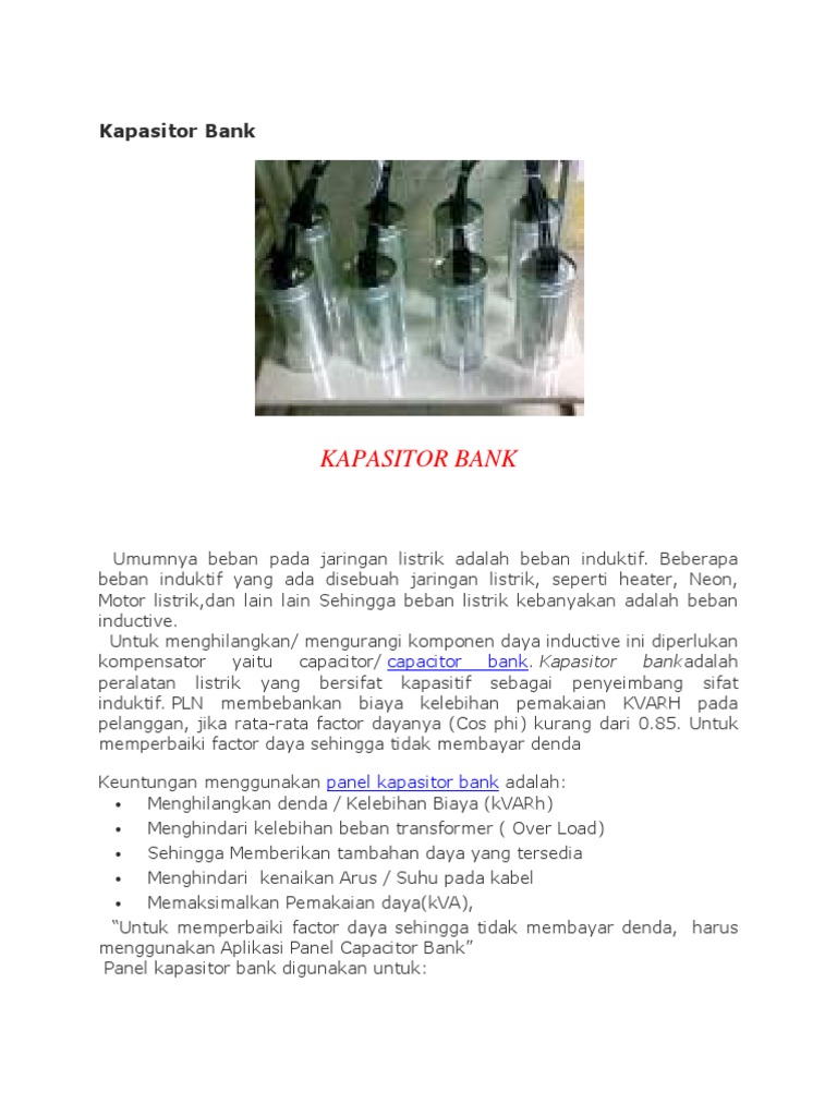 Kapasitor Bank | Migas-Indonesia.com Capacitor bank adalah electrical equipment untuk meningkatkan power factor(PF), dimana akan Nah, dengan memasang kapasitor bank ini Anda akan mendapatkan peningkatan faktor daya 2. Daya aktif (P) dalam satuan Watt P = C x K1 x Tegangan x Arus Dimana : K1 sering disebit dengan...