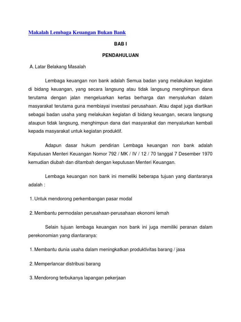 My Aisy Story: Makalah Lembaga Keuangan Non Bank May 23, 2012 · Akhirnya kami dapat mewujudkan satu karya tulis yang berbentuk makalah untuk memenuhi tugas persentasi mata kuliah Lembaga Keuangan Non Bank yang berjudul Lembaga Keuangan Mikro & Syariah ( Koperasi & BMT ) Kami menyadari bahwa makalah ini masih banyak kekurangan. Oleh karena itu, besar harapan kami mendapat masukan, kritik, dan saran dari ... Makalah Lembaga Keuangan Bukan Bank - 123dok Makalah Lembaga Keuangan Bukan Bank. BAB I PENDAHULUAN A. Latar Belakang Masalah. Lembaga keuangan non bank adalah Semua badan yang melakukan kegiatan di ...
