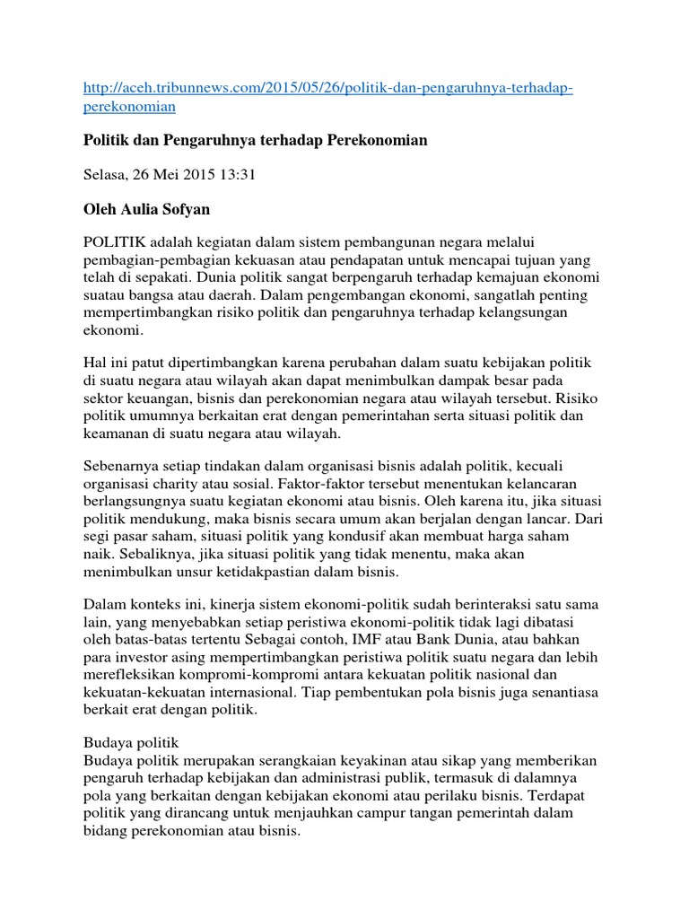 crowszan: DAMPAK POLITIK TERHADAP KERJASAMA PERDAGANGAN ... Tiap pembentukan pola bisnis juga senantiasa berkait erat dengan politik. Budaya politik merupakan serangkaian keyakinan atau sikap yang memberikan pengaruh terhadap kebijakan dan administrasi publik di suatu negara, termasuk di dalamnya pola yang berkaitan dengan kebijakan ekonomi atau perilaku bisnis. Hubungan Politik dan Bisnis - Blogger Politik akan memberikan pengaruh yang sangat besar untuk perjalanan bisnis anda. Situasi politik yang tidak stabil akan mengakibatkan perekonomian yang merosot sehingga memiliki dampak besar terhadap bisnis yang sedang anda jalani. Mengapa Pemilu Berpengaruh terhadap Ekonomi ... - Bisnis.com Pengaruh Pemilu terhadap dunia ekonomi dalam negeri terlihat dari hasil penelitian Unit Riset dan Pengabdian Masyarakat (RPM) Fakultas Ekonomi dan Bisnis (FEB) Universitas Indonesia (UI) pada 2014. Dalam laporan kuartal volume 1 tahun 2014, RPM FEB UI memaparkan pengaruh kontestasi Pemilihan Presiden (Pilpres) saat itu dengan nilai tukar rupiah ... PENGARUH POLITIK TERHADAP PEREKONOMIAN INDONESIA - fitrishaadr Tiap pembentukan pola bisnis juga senantiasa berkait erat dengan politik. Budaya politik merupakan serangkaian keyakinan atau sikap yang memberikan pengaruh terhadap kebijakan dan administrasi publik di suatu negara, termasuk di dalamnya pola yang berkaitan dengan kebijakan ekonomi atau perilaku bisnis.