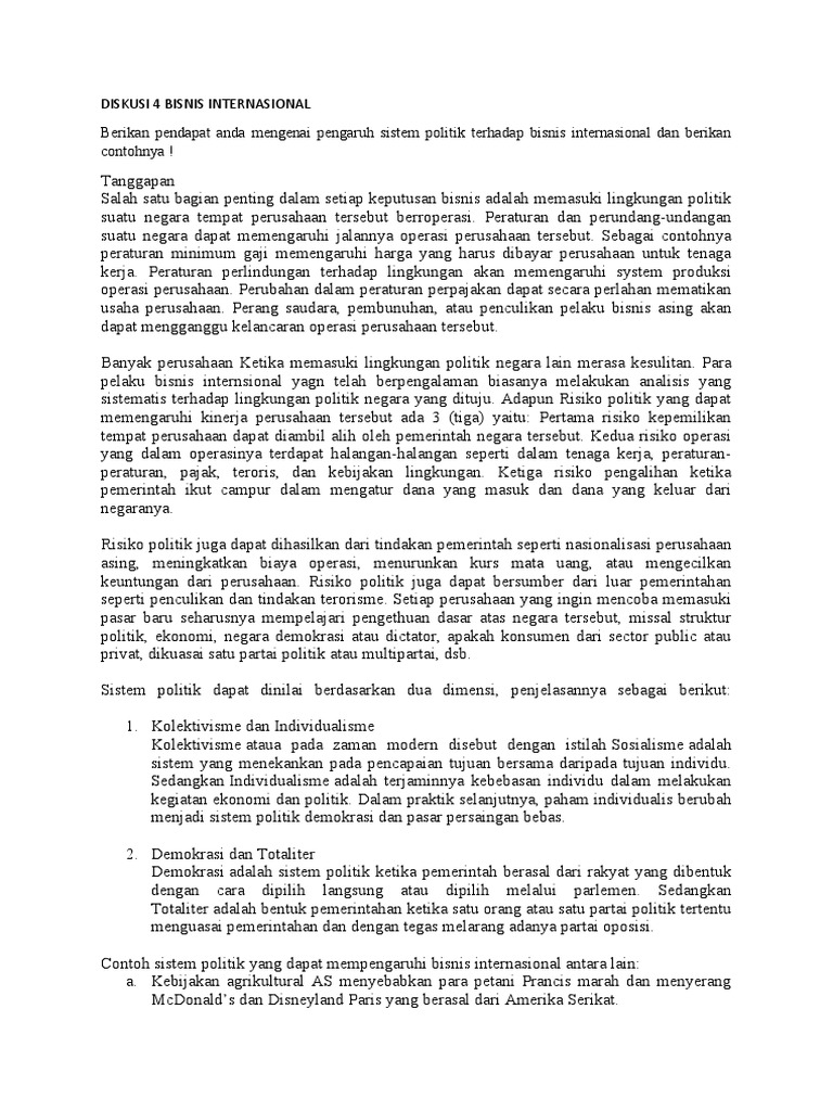 Pengaruh politik terhadap bisnis. (DOC) pengaruh politik terhadap bisnis | Angga Aditya Pratama ... Budaya politik merupakan serangkaian keyakinan atau sikap yang memberikan pengaruh terhadap kebijakan dan administrasi publik di suatu negara, termasuk di dalamnya pola yang berkaitan dengan kebijakan ekonomi atau perilaku bisnis. Terdapat politik yang dirancang untuk menjauhkan campur tangan pemerintah dalam bidang perekonomian/bisnis. Pengaruh Isu Politik Terhadap Bisnis Ekspor Produk Budaya ... PENGARUH ISU POLITIK TERHADAP BISNIS EKSPOR PRODUK BUDAYA KOREA SELATAN DI CINA (STUDI KASUS: INSIDEN BENDERA TAIWAN OLEH CHOU TZU-YU) Jelita Sari Wiedoko 12/328698/SP/25074 ABSTRACT South Korea has been understood as actively exporting its cultural product to other countries, known as Hallyu Wave. (DOC) PENGARUH LINGKUNGAN POLITIK | Yohanes Lilik Rudianto ... Bisnis Sebagai Peserta Politik Ada perdebatan serius diantara mereka yang mendukung dan mereka yang menentang keterlibatan bisnis dalam urusan pemerintahan. Perdebatan ini melibatkan pertanyaan apakah, dan sejauh mana bisnis harus berpartisipasi secara legal di dalam proses politik. BISNIS INTERNASIONAL (Kekuatan Hukum, Teknologi dan Politik) Risiko politik adalah perubahan-perubahan dalam lingkungan yang mungkin akan membawa pengaruh yang merugikan terhadap nilai kegiatan-kegiatan bisnis suatu perusahaan. Risiko politik dapat menimpa semua perusahaan dengan sama rata atau hanya difokuskan pada beberapa perusahaan tertentu.