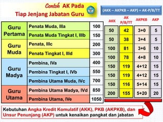 Mekanisme dan prosedur pengajuan penilaian angka... 1. Sekretaris Jenderal menetapkan angka kredit untuk kenaikan jabatan/pangkat Guru Pembina Tk. Angka kredit merupakan representasi Prestasi Kerja yang berkaitan dengan tugasnya. Dengan demikian, guru yang berprestasi dapat lebih cepat naik jabatan/pangkat.