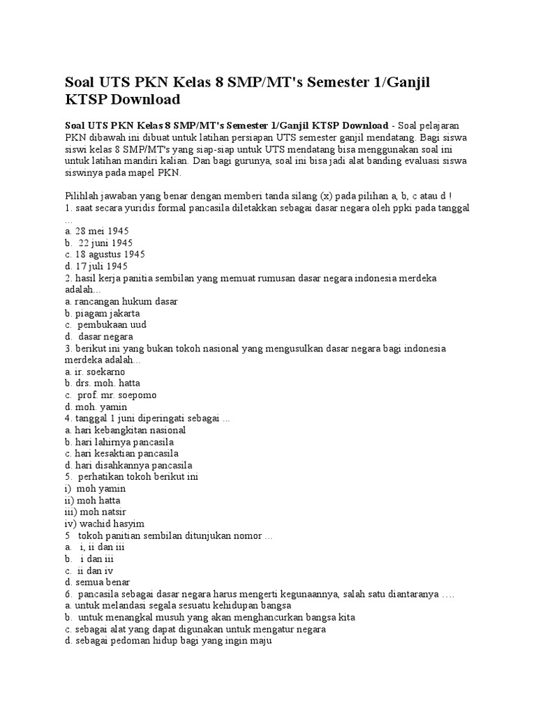 Soal UTS PKN Kelas 8 Semester 2/Genap... | Soal Ulangan Sekolah Silahkan disimak soal soal dibawah ini. Soal UTS (Ulangan Tengah Semester) 2 PKn Kelas VIII SMP. 1. Berdasarkan pengalaman sejarah, kita menolak demokrasi Soal PAS PAI Semester 1 SD SMP SMA SMK -Assalamualaikum Wr Wb, temen-temen soalulangansekolah semuanya, pada posting kali...