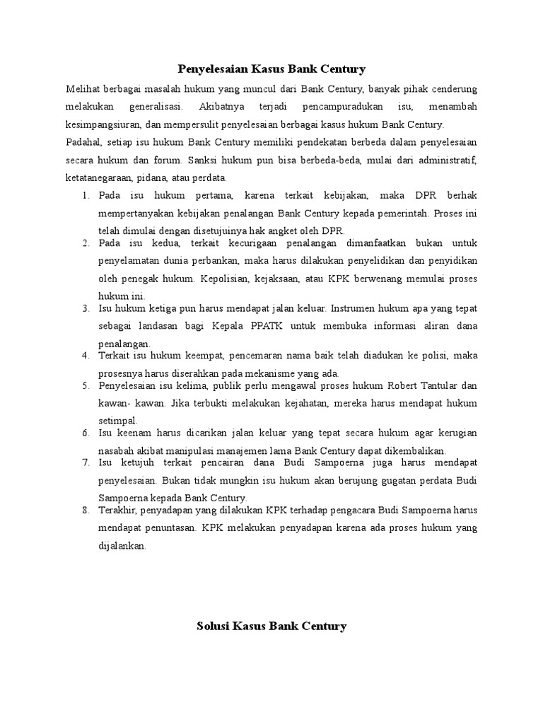 Dedi arianto: Tugas makalah kasus Bank Century Analisis kasus bank century. Penyusun : Dedi Arianto. BAB I Pendahuluan. 1.1 Latar Belakang Masalah. Manusia sebagai makhluk ciptaan Tuhan YME dan sebagai Dalam kasus bank century ini, banyak sekali masalah yang harus di teliti karena sudah banyak merugikan keuangan... Studi kasus bank century Kembali pada topik kasus bank century, apakah bank century dapat diakatan dalam kondisi sehat ? atau malah sebaliknya ? jawabannya adalah Kasus bank century menjadi topik terhangat baik dikalangan ekomom maupun politikus, karena kasus bank century merupakan kasus besar yang...