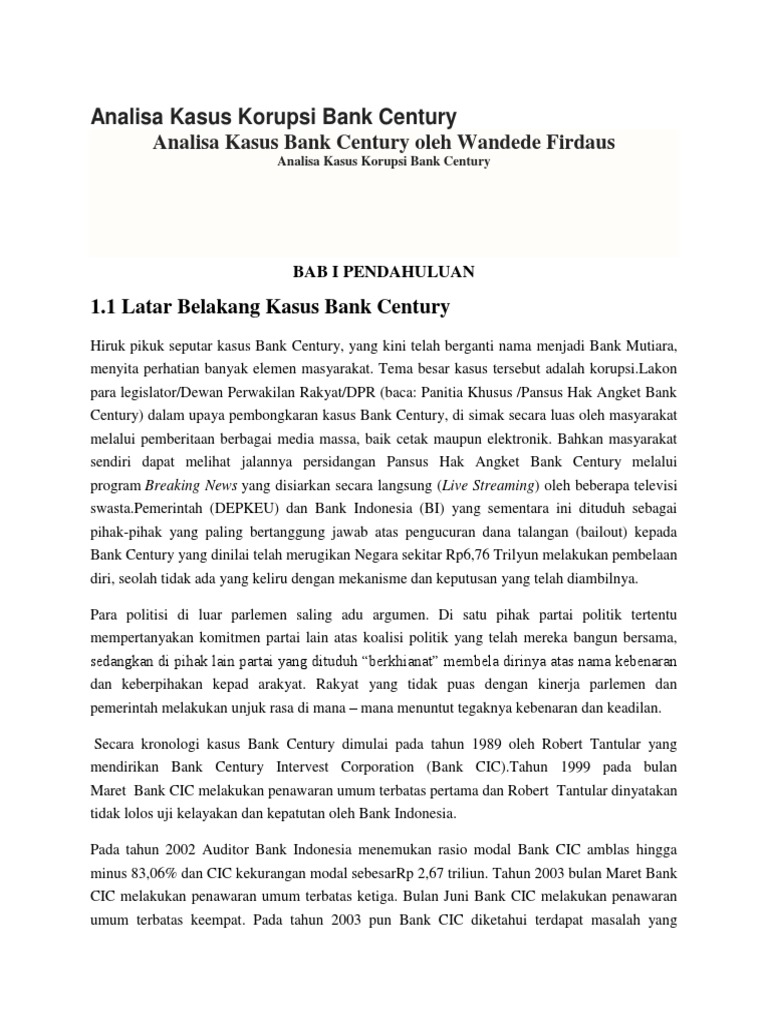 Kasus korupsi bank century BAB I. PENDAHULUAN. A. Latar Belakang Kasus Bank Century. Hiruk pikuk seputar kasus Bank Century, yang kini telah berganti nama menjadi Bank Mutiara, menyita perhatian banyak elemen masyarakat. Tema besar kasus tersebut adalah korupsi.