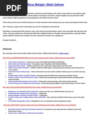 Belajar saham untuk pemula pdf. PPN Saham Jadi 11 Persen, Indo Premier Serap Kenaikan 1 Persen Jakarta, Beritasatu.com-PT Indo Premier Sekuritas memutuskan untuk menyerap kenaikan PPN 1 persen dan tidak menaikkan fee transaksi saham seperti yang dilakukan beberapa Anggota Bursa (AB) atau perusahaan sekuritas lain.Keputusan ini dilakukan Indo Premier untuk mendukung penuh kebijakan pemerintah terkait tarif Pajak Pertambahan Nilai (PPN) yang mengalami kenaikan menjadi 11 persen. Bijak Dalam Memilih Saham Syariah Memilih saham syariah dengan harga yang murah memang disarankan untuk pemula yang baru memulai berinvestasi. Tapi, jangan mudah tergiur ya. Tidak ada salahnya memilih saham dengan harga murah namun sebaiknya Selain melihat harga, calon investor juga harus memperhatikan kualitas saham tersebut dengan cara melakukan analisa terlebih dahulu ... Cara Menghitung Return Saham, Capital Gain atau Capital ... Mengutip dari laman Bursa Efek Indonesia, saham (stock) merupakan salah satu instrumen pasar keuangan yang paling populer.Menerbitkan saham merupakan salah satu pilihan perusahaan ketika memutuskan untuk pendanaan perusahaan. Pada sisi yang lain, saham merupakan instrumen investasi yang banyak dipilih para investor karena saham mampu memberikan tingkat keuntungan yang menarik. Memahami Saham Gorengan: Pengertian, Ciri-ciri dan Tips ... Saham-saham ini kemudian dimanipulasi oleh oknum dengan tujuan memperoleh keuntungan. Oleh karena itu, pastikan untuk selalu berhati-hati memilih saham, terutama bagi investor pemula yang terjun ke pasar bursa. Alih-alih memperoleh banyak keuntungan, terjebak dalam saham gorengan justru membuat investor boncos.