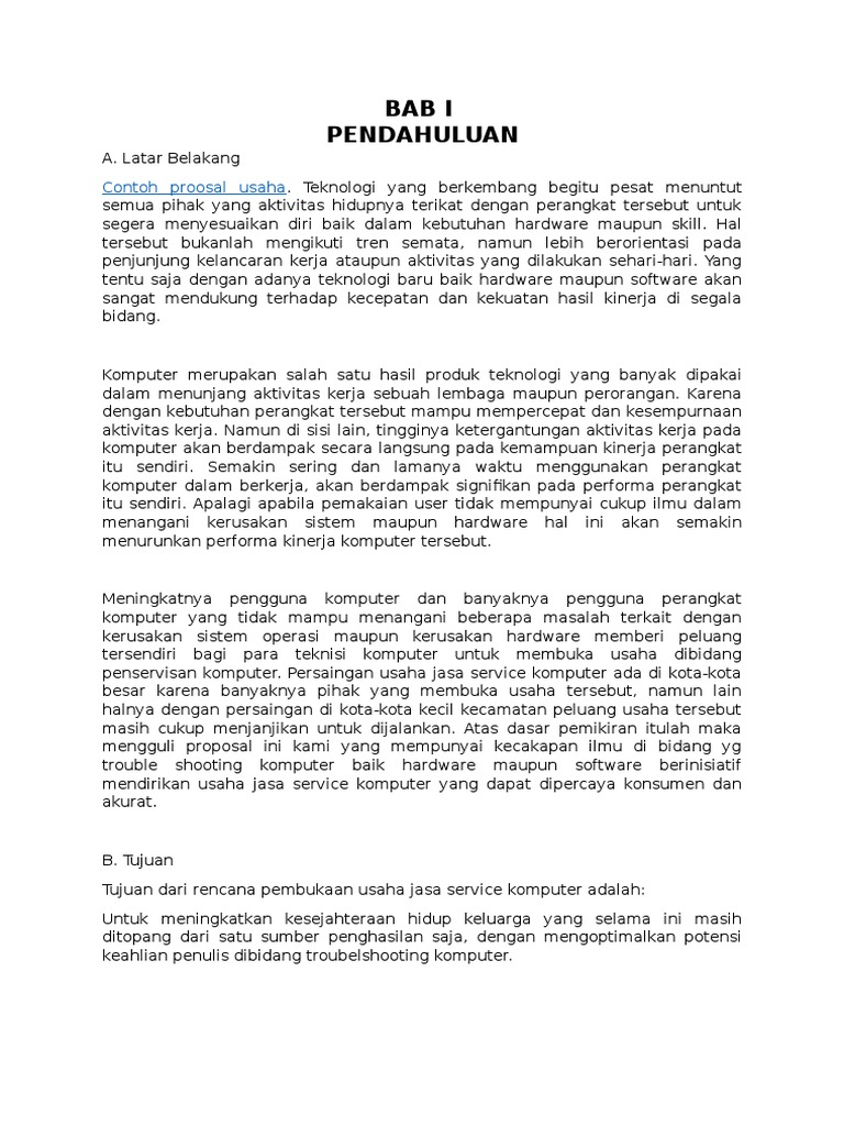 Contoh Proposal Usaha Jasa, Dagang, Kerajinan, dan Makanan ... Adanya contoh proposal usaha memudahkan dalam menjalankan sebuah bisnis. Karena di dalamnya terdapat tujuan dan pedoman secara detail dan jelas. Selain itu dengan adanya proposal usaha bisa digunakan untuk mencari tempat yang tepat, bahkan klien yang bisa diajak untuk kerjasama.