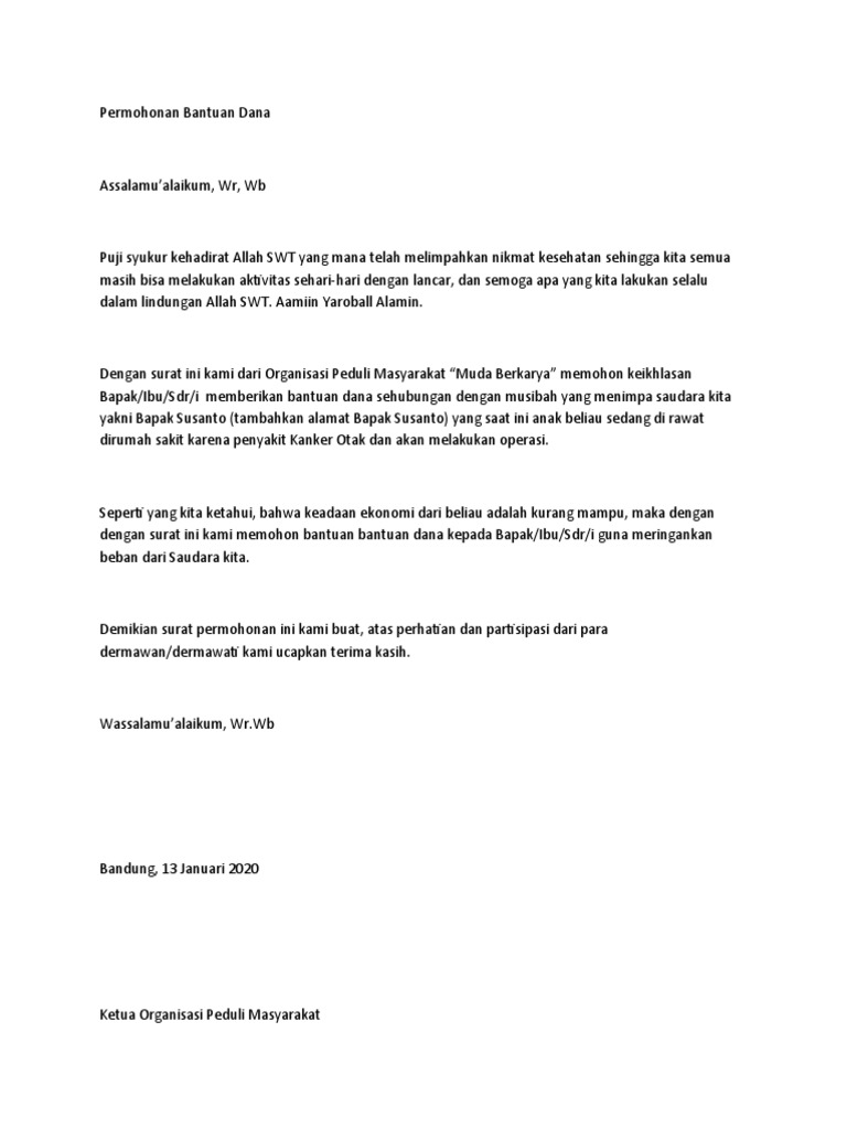 › contoh-surat-pengajuan-permohonan15 Contoh Surat Pengajuan Permohonan Izin, Bantuan dan ... Mar 27, 2018 · 15 Contoh Surat Pengajuan Permohonan Izin, Bantuan dan Kerjasama - Seiring dengan perkembangan zaman dan kemajuan teknologi yang semakin canggih, penggunaan surat sebagai media komunikasi pun memang semakin menipis. Benar - benar berbeda keadaanya dengan dulu, dimana semua orang masih hanya mengandalkan surat jika ingin berkomunikasi jarak jauh. Contoh Surat Permohonan Bantuan Dana Contoh Surat Permohonan Bantuan Dana - Memang ada banyak sekali jenis surat yang di butuhkan dalam kehidupan kita sehari-hari, salah satunya yaitu surat permohonan bantuan dana yang biasanya digunakan untuk mencari tambahan dana bagi suatu kegiatan. Contoh Surat Permohonan Bantuan Dana Kegiatan Contoh Surat Permohonan - Setiap orang pasti pernah mengalami kesulitan entah seberapa matang rencana yang telah dibuat. Apalagi jika berurusan dengan pembuatan acara, kegiatan bakti sosial, hingga urusan kedinasan. Kendala-kendala ini tidak dapat diselesaikan sendiri tanpa bantuan orang... Contoh Surat Permohonan Bantuan Dana Pembangunan Masjid Demikianlah surat permohonan bantuan dana ini kami buat dan sampaikan. Atas perhatian dan partisipasinya kami ucapkan terima kasih. Jika Contoh Surat ini berguna untuk Anda, berikan kontribusi kepada kami dengan membagikan contoh surat ini di sosial media melalui tombol share di...