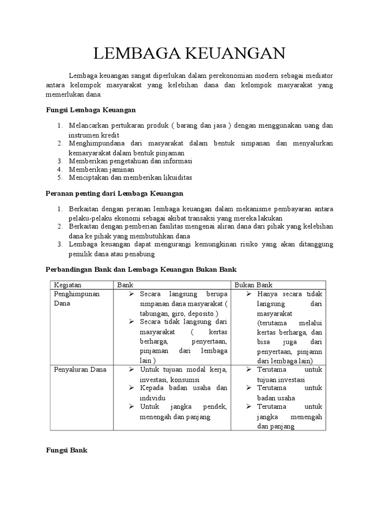 Peranan lembaga keuangan bukan bank. Lembaga Keuangan Bukan Bank... | TutorialBahasaInggris.Co.Id Di Indonesia Lembaga Keuangan Bukan Bank berkembang sejak tahun 1972. Secara umum tujuan lembaga keuangan bukan bank adalah untuk memberikan bantuan serta mendorong perkembangan pasar modal untuk membentuk permodalan perusahaan-perusahaan yang memiliki ekonomi rendah. 11 Fungsi Lembaga Keuangan - Bank dan Bukan Bank Lembaga keuangan pada umumnya dibagi menjadi dua yakni lembaga keuangan bank dan lembaga keuangan non bank. Semua jenis ini memiliki fungsinya tersendiri. Untuk lembaga keuangan non Bank memiliki beberapa fungsi antara lain (DOC) lembaga keuangan bank dan non bank - Academia.edu Lembaga keuangan bukan bank ini sendiri terbagi menjadi lima bagian. Diantaranya adalah : Thrift Lembaga ini memberikan pelayanan dalam bentuk penyimpanan tabungan, pinjaman, serta kredit. Secara umum, aktivitasnya mirip seperti lembaga perbankan. 2. Lembaga Keuangan Bukan/Non Bank Peranan Lembaga Keuangan dalam Perekonomian. Lembaga keuangan melakukan stugas sebagai pihak yang ahli dalam hal menganalisis ekonomi serta kredit. Untuk sebuah kepentingan sendiri dan juga kepentingan lain (nasabah).