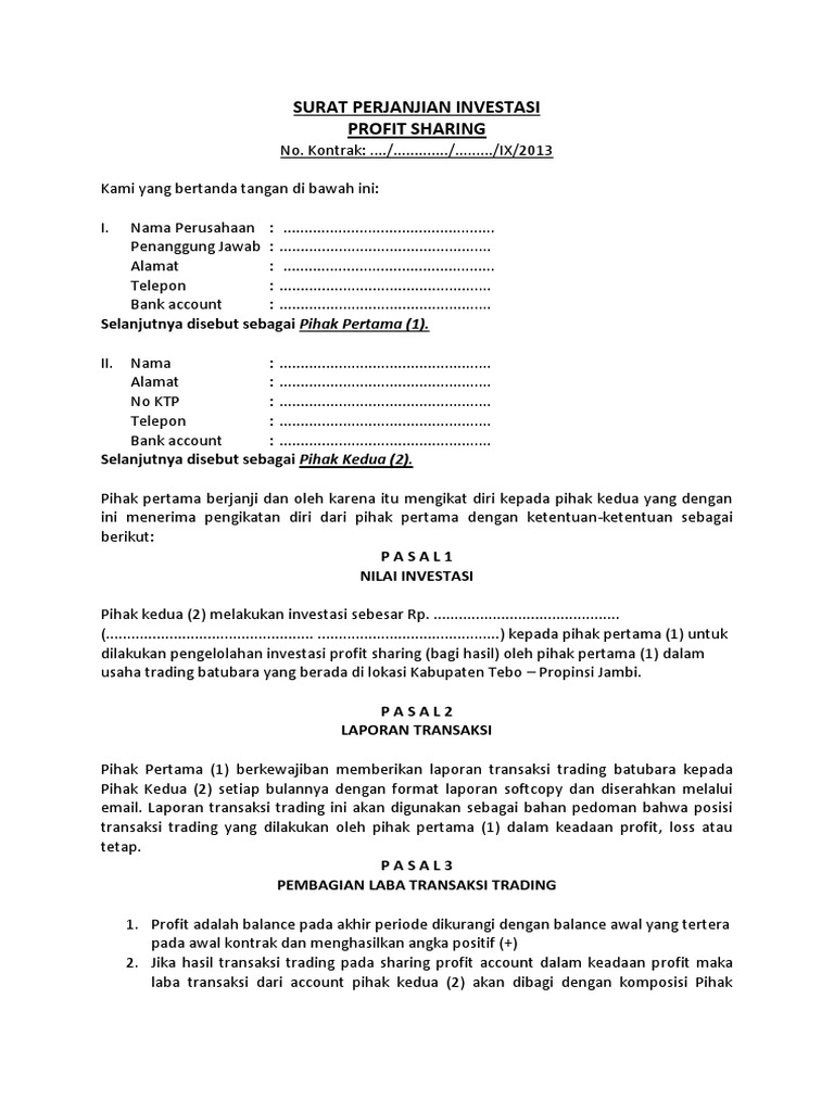 Contoh Perjanjian Investasi Bagi Hasil - Kayamara Surat perjanjian kerja sama dan ketentuan pasal-pasal nya silakan Anda modifikasi sendiri, setidaknya Contoh Surat Perjanjian Kerjasama Investasi Modal Usaha ini bisa Anda jadikan referansi. Kedua pihak akan mendapatkan keuntungan hasil usaha menurut persentase keuntungan yang disepakati. Contoh mentahnya adalah seperti berikut :