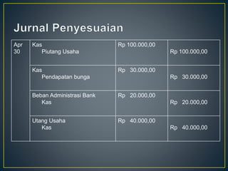 BAB 10 PENCATATAN JURNAL PENYESUAIAN. Asgard Chapter Oleh karenanya, perusahaan mencatat jurnal penyesuaian untuk mengakui pendapatan bunga bank tersebut. g. Pengakuan biaya dari piutang tak tertagih; penjualan kredit memungkinkan terjadinya kerugian akibat tidak tertagihnya piutang. Penempatan pada bank lain & Penempatan pada Surat Berharga Tingkat bunga yang diberikan Bank Sejahtera sebesar 15%, jangka waktu 90 hari. 1.Penempatan pada bank lain adalah penempatan/tagihan atau Pendapatan bunga - surat berharga Rp. 30.000.000 Kr. Kas/Rekening…/Giro BI Rp. 1.024.250.000 d. Pada saat melakukan jurnal balik komitmen pembelian... Pendapatan Bunga Kerek Laba Bersih Bank Mantap - Finansial... Pendapatan bunga dan pendapatan syariah Bank Mantap tumbuh 36 persen secara tahunan pada 2019. Direktur Utama PT Bank Mandiri Taspen (Bank Mantap) Josephus K Triprakoso (kanan) bersama Direktur Nurkholis Wahyudi (kiri) dan Direktur Pengelolaan Kas Negara Kementerian...
