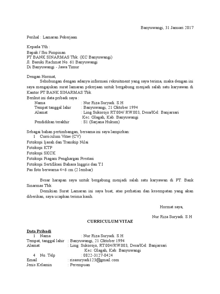 Contoh Surat Lamaran Kerja di Bank Terbaru 2014 - Lowongan Kerja... Sebagai Contoh Surat Lamaran Kerja Bank yang baik dan benar anda bisa melihat contoh dibawah ini. Foto copy Ijazah (terligalisir) : 1 (Satu) lembar Foto copy nilai akademis (terligalisir) : 1 (Satu) lembar Foto copy daftar riwayat hidup : 1 (Satu) lembar Fotocopy surat pengalaman kerja (jika ada)... Lowongan Kerja PT Bank Sinarmas Tbk - Minimal D3 Semua Jurusan PT Bank Sinarmas Tbk kembali membuka lowongan kerja terbaru untuk lulusan D3 semua jurusan silahkan cek dan daftar sekarang. Bank Sinarmas Tbk. didirikan pada 18 Agustus 1989 dengan visi untuk menjadi bank terkemuka di Indonesia dengan jaringan distribusi terintegrasi dan kinerja... Pengalaman Deposit ke RDN Sinarmas Sekuritas - eMingko Blog Begitu saya buka aplikasi Sinarmas Equity kemudian cek di menu portofolio ternyata di bagian deposit angkanya masih 0. Saya pikir karena transfer antar bank jadi butuh Waktu setidaknya 1 sampai 2 hari kerja apalagi ini adalah jenis rekening RDN yang bisa saja membutuhkan verifikasi dari pihak...