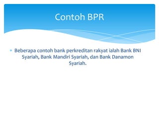 Perbedaan Bank Umum, Bank Perkreditan Rakyat, dan Bank ... Bank Perkreditan Rakyat o Menghimpun dana dari masyarakat dalam bentuk simpanan berupa deposito berjangka tabungan dan atau bentuk lainnya yang dipersamakan dengan itu o Menyediakan pembiayaan dan penempatan dana berdasarkan prinsip syariah sesuai dengan ketentuan yang ditetapkan oleh Bank Indonesia o Menempatkan dananya dalam bentuk Sertifikat Bank Indonesia ( SBI ), deposito berjangka ...