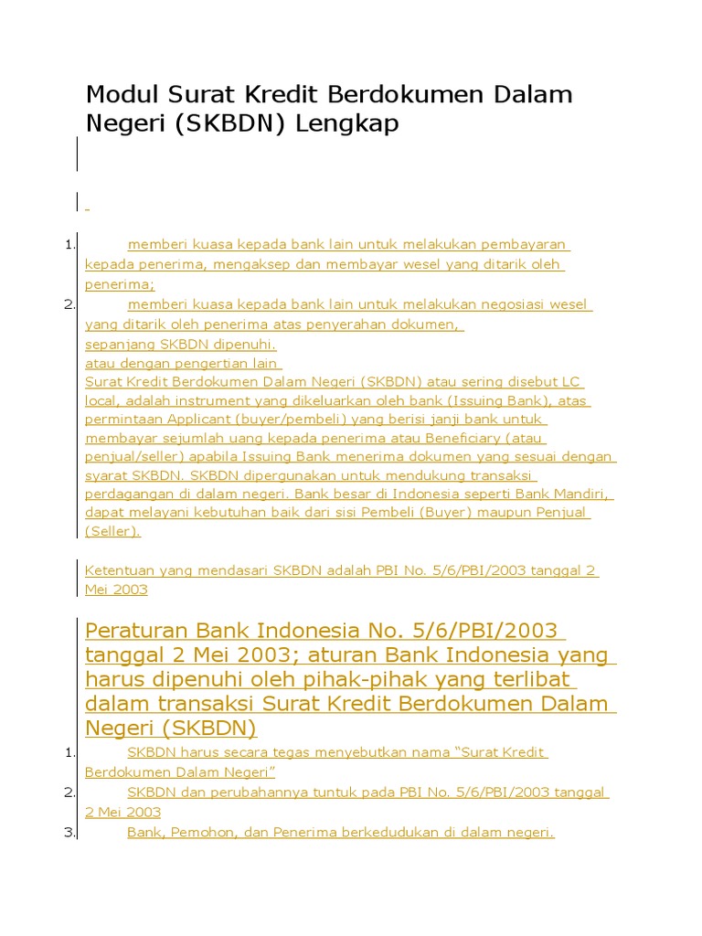 Surat Kredit Berdokumen Dalam Negeri (Skbdn) SURAT KREDIT BERDOKUMEN DALAM NEGERI (SKBDN) Surat Kredit Berdokumen Dalam Negeri (skbdn) adalah domestic L/C yaitu janji tertulis pemohon yang mengikat bank pembuka untuk : 1) melakukan pembayaran kepada penerima atau ordernya, atau mengaksep dan membayar wesel yang ditarik oleh penerima; 2) memberi kuasa kepada bank lain untuk melakukan pembayaran kepada penerima, mengaksep dan membayar ...