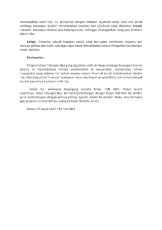 Penerapan Akad Al-Qardh Wal Ijarah Pada Produk Talangan Haji ... Hasil penelitian ini menunjukkan bahwa produk dana talangan haji di Bank Mandiri Syariah KCP Sungguminsa menggunakan akad qardh walijarah, yaitu dana yang dipinjamkan oleh pihak Bank kepada nasabah calon haji dan biaya sewa/ujrah sistem IT yang dimiliki BSM dibebankan kepada nasabah. Haji dengan bank syariah mandiri | Biro Perjalanan ONH Plus ... Mar 17, 2013 · Oleh karena itu kami saat ini telah bekerja sama dengan Bank Syariah Mandiri dan bank Muamalat, Insya Allah dapat mewujudkan impian Anda menawarkan solusi khusus bagi calon jamaah melalui program Dana Talangan Haji dengan bank syariah rekanan kami. Persyaratan untuk mendapatkan program dana talangan Haji adalah sebagai berikutL