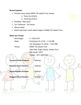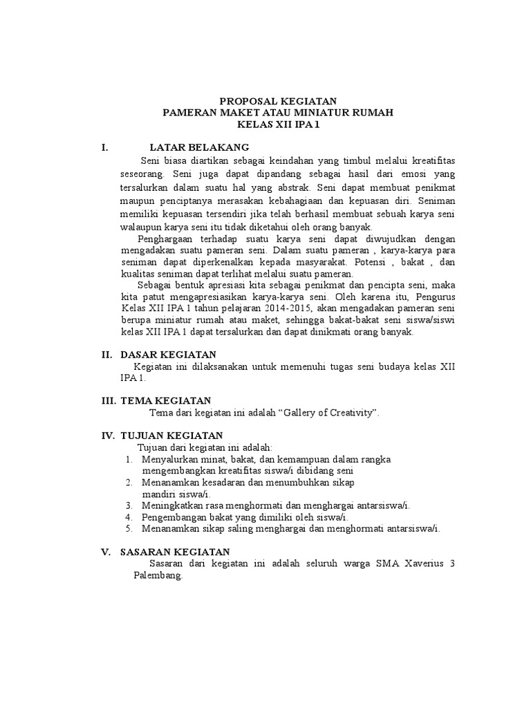 12 Contoh Proposal Kegiatan Pameran, Sekolah, Pramuka Dll 12 Contoh Proposal Kegiatan Pameran, Sekolah, Pramuka Dll. Contoh Proposal Kegiatan Pameran terlengkap dari kegiatan sekolah berupa pameran, acara pramuka, pentas seni, sampai dengan acara bakti sosial. Dalam hal ini akan kami sajikan sebagai salah satu referensi sahabat dalam membuat sebuah proposal pengajuan dana atau bantuan dengan baik dan ...