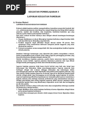 Apa fungsi utama pameran seni? - lovelyristin.com Fungsi Pameran. Pameran seni rupa yang diselenggarakan di sekolah, biasanya merupakan pameran heterogen, karena menampilkan jenis karya seni rupa yang beragam. Fungsi utama dari pameran seni rupa pada hakekatnya adalah untuk membangkitkan apresiasi seni pada siswa, di samping sebagai media komunikasi antara seniman dengan penonton. Laporan Kegiatan: Pengertian, Ciri-Ciri, dan Struktur ... Ciri-ciri Laporan Kegiatan. Ada pun ciri-ciri laporan kegiatan, di antaranya sebagai berikut: Terdiri dari tiga bagian, yaitu pendahuluan, isi, dan penutup. Penggunaan bahasa harus jelas agar pembaca laporan kegiatan dapat memahami dengan tepat, tanpa menimbulkan persepsi yang berbeda.