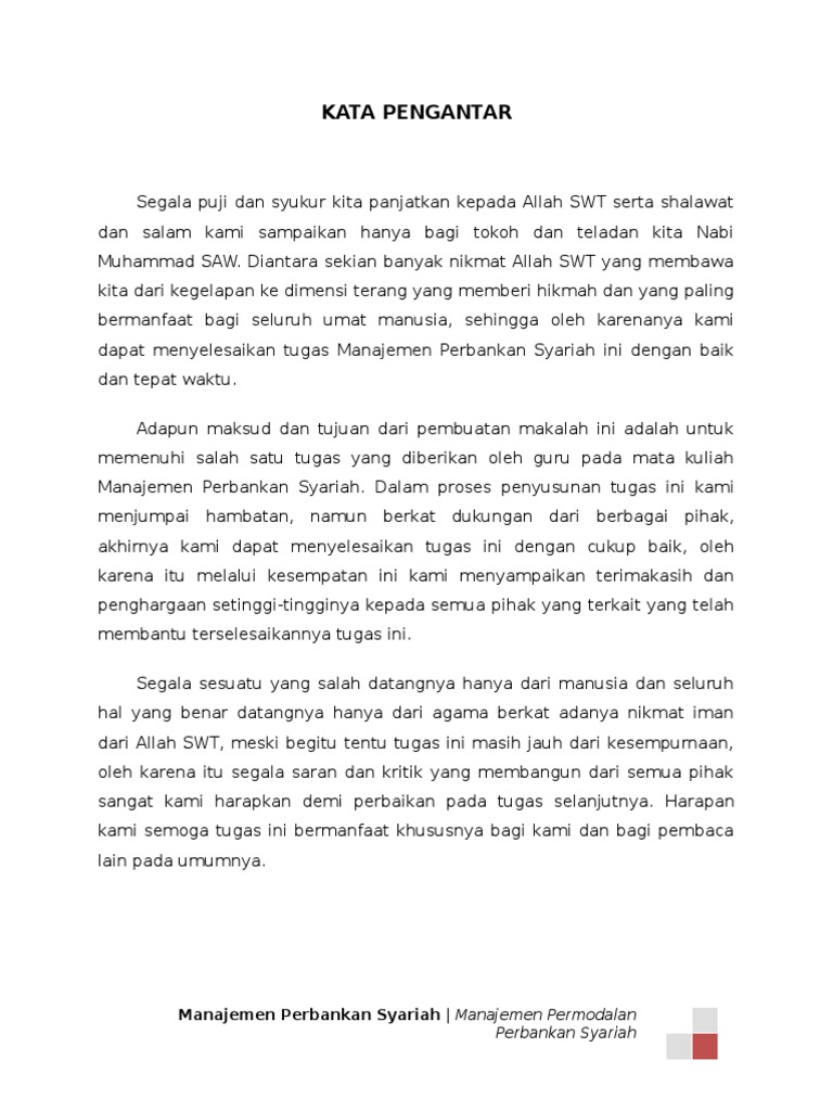 Modal Perbankan Syariah | PDF - Scribd MAKALAH. MANAJEMEN PERMODALAN BANK SYARIAH. Diajukan untuk Memenuhi Tugas Terstruktur Mata kuliah : Manajemen Perbankan Syariah Dosen Pengampu: Alvien Septian Haerisma, SEI, MSI.. Disusun Oleh : Dewi Riyanti 58320173 Maskur 58320192 Mustopa 58320198 Sukaesih 58320209 Saiful Hadi 58320264