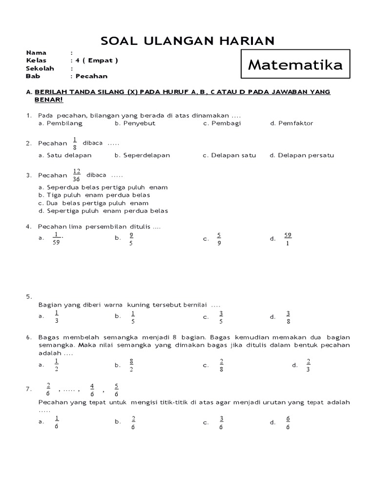 Soal Ulangan Matematika Kelas 4 Semester 1 K-13 ... Contoh Soal Ulangan Matematika Kelas 4 Semester 1 K-13 Kerjakan soal-soal di bawah ini dengan benar! 1. Pecahan yang senilai dengan 4/8 adalah .... 4. Bentuk sederhana dari pecahan 6/18 adalah ... 7. Pak Surya mempunyai persediaan beras 8/10 ton. Dalam seminggu terjual 3/5 ton. Berapa ton kah sisa beras Pak Surya? 10.