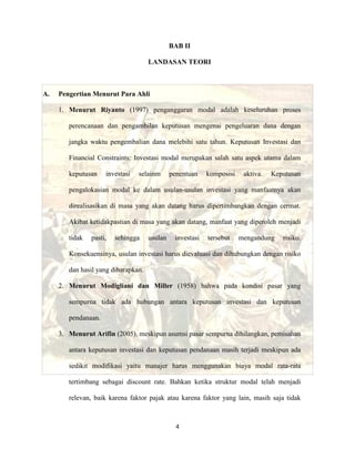 Pengertian, Tujuan, Keputusan, dan Teori Investasi Menurut ... Teori Investasi Menurut Para Ahli Tiap ahli memiliki teori investasinya sendiri-sendiri. Beberapa diantaranya adalah sebagai berikut. Teori Investasi 1 : Investasi untuk Pengembalian Positif Investasi artinya menempatkan dana dalam jumlah besar untuk mempertahankan, meningkatkan nilai, atau memberikan pengembalian yang positif (Sutha, 2020).