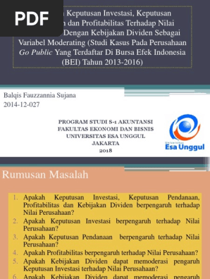 Pengaruh Kebijakan Dividen, Keputusan Investasi Dan ... pengaruh kebijakan dividen, keputusan investasi dan keputusan pendanaan terhadap nilai perusahaan pada perusahaan sektor pertambangan yang terdaftar di Bursa Efek Indonesia periode 2016-2020. Penelitian ini dilakukan dengan menggunakan pendekatan kuantitatif dan data sekunder yang diperoleh dari idx. Populasi yang digunakan sebanyak 47 (PDF) Pengaruh Keputusan Investasi, Ukuran Perusahaan ... Nilai perusahaan sendiri dipengaruhi oleh banyak sekali faktor antara lain keputusan investasi, ukuran perusahaan, dan kebijakan dividen. Nilai perusahaan merupakan gambaran keadaan sebuah perusahaan, dimana terdapat penilaian khusus oleh calon investor terhadap baik buruknya kinerja keuangan perusahaan. PDF Skripsi Pengaruh Keputusan Investasi, Keputusan Pendanaan ... Hasil penelitian menunjukkan bahwa keputusan investasi, keputusan pendanaan, kebijakan deviden, profitabilitas dan tingkat suku bunga secara simultan berpengaruh signifikan terhadap nilai perusahaan. Hasil uji parsial menunjukkan bahwa keputusan investasi berpengaruh positif dan tidak signifikan terhadap nilai perusahaan.
