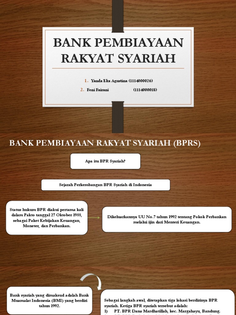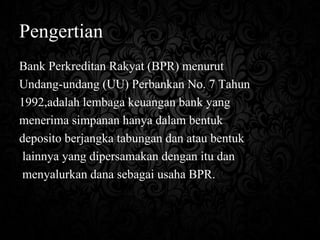 PPT Bank Perkreditan Rakyat Syariah ( B P R S ) - STIEMJ Bank Pembiayaan Rakyat Syariah ( B P R S ) Pertemuan 6 Pengertian Bank Perkreditan Rakyat (BPR) menurut Undang-Undang Perbankan No. 7 tahun 1992, adalah lembaga keuangan bank yang menerima simpanan hanya dalam bentuk deposito berjangka tabungan, dan/atau bentuk lainnya yang dipersamakan dengan itu dan menyalurkan dana sebagai usaha BPR.