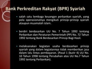 PDF Bank Umum Konvensional dan Syariah Bank Perkreditan Rakyat ... 2. Bank syariah Keduanya dapat berbentuk bank umum dan BPR. Bank Perkreditan Rakyat (BPR) dan Bank Pembiayaan Rakyat Syariah (BPRS) adalah bank yang dalam kegiatannya tidak memberikan jasa dalam lalu lintas pembayaran, dan tidak dapat melakukan transaksi giral. Selain memberikan pinjaman, BPR dan BPRS juga menerima layanan simpanan tabungan dan ...