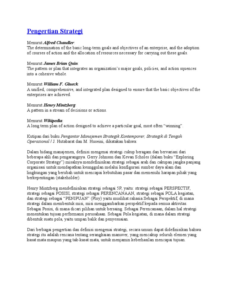 Strategi Bisnis Adalah, Pengertian, Jenis, Prinsip ... Ada dua pengertian strategi bisnis, yakni secara umum dan menurut para ahli. Keduanya bisa disimak lebih lanjut pada pembahasan berikut. Pengertian Strategi Bisnis Secara Umum. Secara umum, pengertian strategi bisnis adalah berbagai jenis upaya untuk memastikan bahwa perusahaan dapat mencapai tujuan secara efektif dan efisien. Pengertian Tujuan Dan Kompascom - Pengertian Manajemen ... Pengertian Manajemen Strategi Dalam Bisnis Manajemen strategi adalah proses atau serangkaian kegiatan pengambilan keputusan yang mendasar dan komprehensif, disertai dengan penentuan Tujuan, Tugas, Manfaat, Para Ahli Pengertian Strategi Menurut Ahli Perumusan Strategi ... Pengertian Strategi - Tingkat, Jenis, Bisnis, Integrasi, Umum, Para Ahli Pengertian Manajemen Strategi Menurut Para Ahli Definisi atau Pengertian Manajemen Strategis ANALISA GENERIC STRATEGY DARI MICHAEL R PORTER ... Beberapa ahli/pendapat/teori yang mendukung kepada strategi generik dari ... ini biasanya diterapkan pada bisnis yang berada pada tahap menurun (decline).13 pages