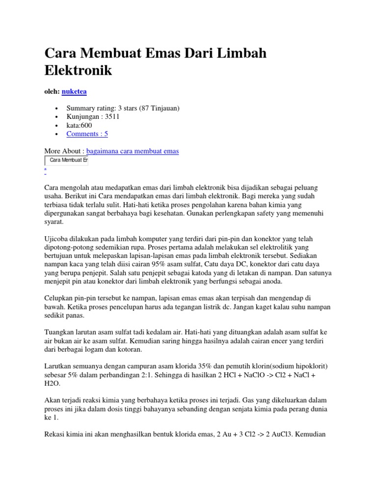 ADA EMAS DALAM SAMPAH ELEKTRONIK - School of Information ... Jika emas dari satu ton ponsel didapat 150 gram emas, maka total emas yang bisa ditambang dari ponsel tua itu mencapai 88,7 kilogram (Majalah Sains Indonesia Edisi 56, 2014). Belajar dari Cina Di Cina sampah elektronik yang masuk ke pelabuhan melalui peti kemas, kemudian dikumpulkan ke penampungan barang elektronik bekas. Pengolahan EMAS DARI Limbah Elektronik - Facebook Pengolahan EMAS DARI Limbah Elektronik. 565 suka. Untuk mengurangi pengangguran dan menambah penghasilan ..hayoo kita mendulang emas dari limbah...