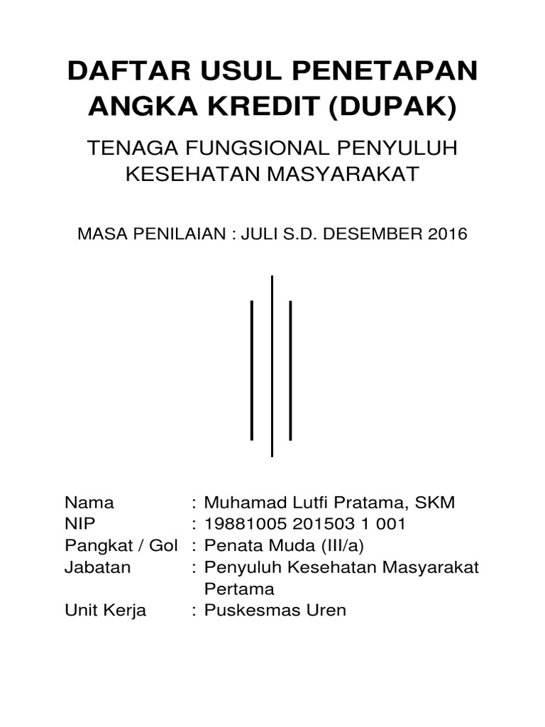 Penyusunan DUPAK 2022, Guru PNS Wajib Tahu Salah satunya adalah menyusun DUPAK . DUPAK sendiri merupakan kependekan dari daftar usulan penetapan angka kredit. Ia menjadi syarat mutlak ketika akan mengajukan kenaikan pangkat dan juga golongan. Penyusunan Dupak ini dibuat tiap tahun, sesuai periode penilaian angka kredit dimulai dari awal masa jabatan fungsional Anda sebagai guru. PDF Petunjuk Teknis Jabatan Fungsional Analis Kepegawaian ... Daftar Usulan Penetapan Angka Kredit (DUPAK) adalah daftar usulan yang memuat data perorangan Analis Kepegawaian yang berisi rincian butir kegiatan dengan mencantumkan nilai/angka kredit yang diperoleh dalam kurun waktu tertentu sebagai bahan penilaian dalam penetapan angka kredit; 6. Pejabat yang menetapkan Angka Kredit adalah Pejabat yang Dupak Puskesmas - Puskesmas Tembelang Daftar Usulan Penetapan Angka Kredit (DUPAK) Puskesmas. Berkas Persyaratan Daftar Usulan Penilaian Angka Kredit yang harus di setorkan : 1. FC Karpeg 2. FC SKP 2 tahun terakhir 3. FC SK CPNS 4. FC SK Kenaikan Pangkat Terakhir 5. FC SK Jabatan Fungsional 6. FC Ijin Belajar 7. FC Ijazah 8. FC PAK Lama