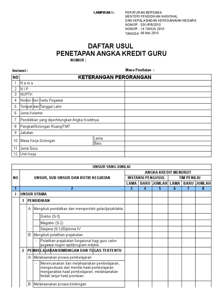 (DOC) DAFTAR USUL PENETAPAN ANGKA KREDIT ... - Academia.edu Bagi guru yang belum pernah mendapatkan PAK , maka melampirkan copy SK terakhir yang tela tercantum angka kreditnya Secara berurutan Daftar Usul Penilaian Angka Kredit Jabatan Guru adalah sebagai berikut : 1. Halaman judul (cover) 2. Lembar Identitas 3. Lampiran I 4. Lampiran II 5. Lampiran III 6.