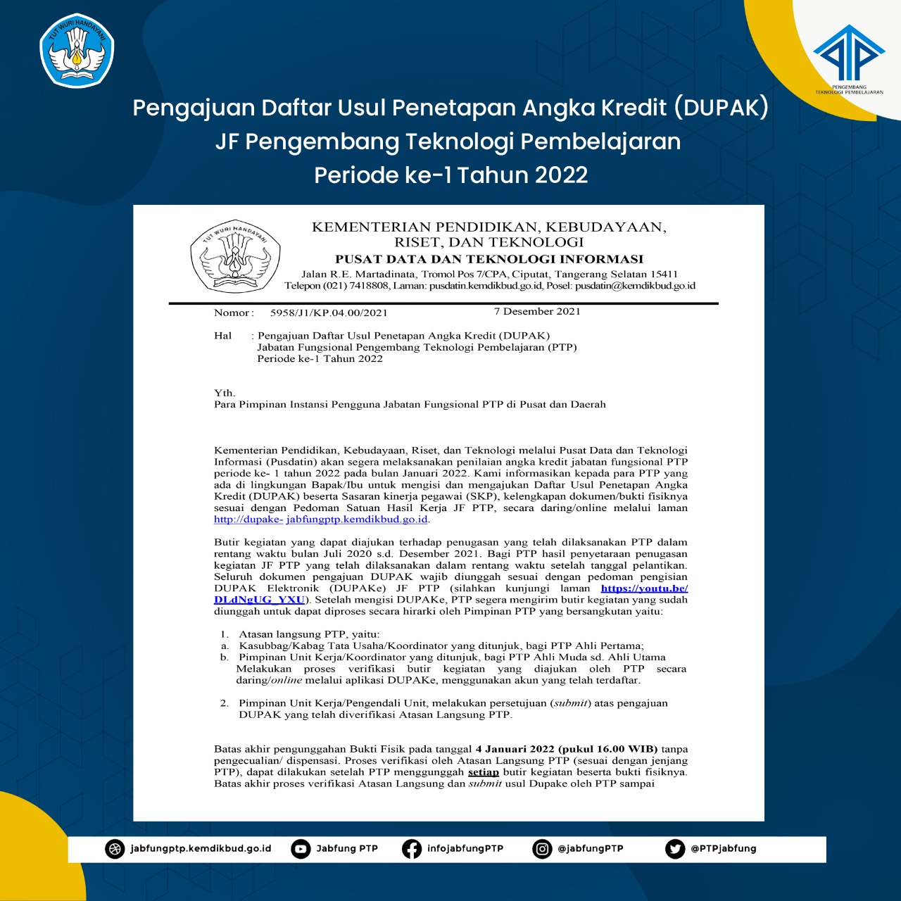 Daftar usulan penetapan angka kredit. Daftar Usulan Penetapan Angka Kredit , Dupak Terbaru Penyusunan dan pengisian Daftar Usulan Penetapan Angka Kredit (DUPAK) bagi Guru dan Kepala Sekolah golongan III/a s.d IV/c meliputi aspek-aspek: a. Pendidikan b. Proses Pembelajaran/Pembimbingan (nilai PKG) c. Pengembangan Diri (PKB) Diklat Fungsional, KKG Publikasi Ilmiah Karya Inovatif d. Unsur Penunjang Kegiatan Guru Bukti Fisik DUPAK PDF Tata Cara Penyusunan Daftar Usulan Penilaian Angka Kredit ... Pengelola PBJ wajib mencatat dan menginvetarisasi seluruh kegiatan yang dilakukan dan mengusulkan Daftar Usulan Penilaian Angka Kredit (DUPAK). Penilaian DUPAK Pengelola PBJ mengusulkan secara hirarki kepada Pejabat yang berwenang paling sedikit 1 (satu) kali dalam 1 setahun. DUPAK diusulkan secara hirarki Aplikasi Dupak Tahun 2021 dan Cara Mudah ... - Suryaman.id DUPAK singkatan dari Daftar Usulan Penetapan Angka Kredit. DUPAK idealnya dibuat tiap tahun. Untuk DUPAK kenaikan pangkat dibuat dua kali dalam setahun tepatnya untuk SK periode April dimasukkan bulan Nopember dan SK dengan Periode Oktober dimasukkan bulan Mei atau Juni. Aplikasi E-dupak (Daftar Usul Penetapan Angka Kredit ... pengelolaan daftar usul penetapan angka kredit (dupak) secara elektronik yang baik akan menjamin ketersediaan bukti keputusan serta kegiatan pemerintah, menunjukkan pemenuhan akuntabilitas jabatan fungsional tertentu, mendukung fungsi dan tugas melalui penciptaan e-dupak yang andal serta dapat digunakan, berkontribusi terhadap efisiensi dan …