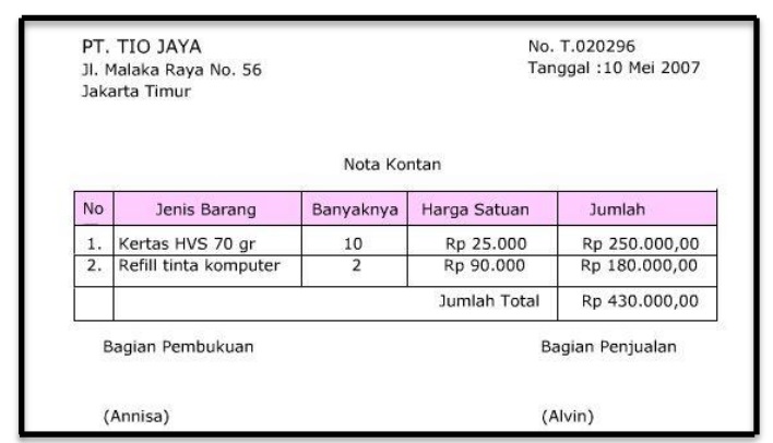 (PDF) Analisis Bukti Transaksi Iffahs | Iffah Syarifah ... Bukti Transaksi Ekstern Bukti transaksi ekstern merupakan bukti pencatatan transaksi yang melibatkan pihak di luar perusahaan. Yang termasuk bukti transaksi ekstern antara lain kuitansi, faktur, nota kontan, nota debet, nota kredit, cek dan bilyet giro. a. Kuitansi Kuitansi adalah tanda bukti terjadinya pembayaran yang dilakukan secara tunai. developing learning media account spin game in - Lumbung ... by DT Kusumawanti · Cited by 1 — Berbagai jenis transaksi diatas harus didukung dengan bukti transaksi. ... Yaitu hutang yang terjadi karena transaksi pembelian barang / jasa secara kredit.208 pages