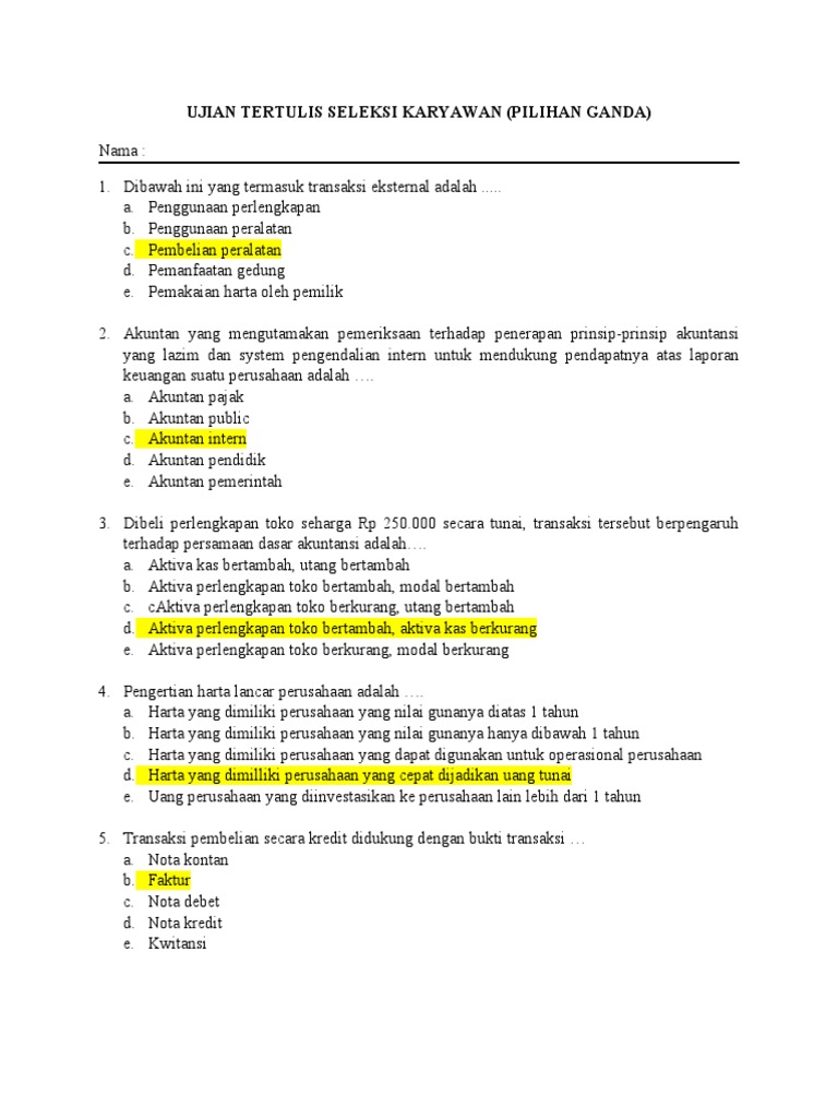 Soal-Soal Akuntansi III Lengkap Dengan Jawabannya Transaksi pembelian secara kredit didukung dengan bukti transaksi … a. Nota kontan b. Faktur c. Nota debet d. Nota kredit e. Kwitansi Jawabannya: b 6. Manakah akun-akun dibawah ini yang termasuk akun-akun nominal. a. Pendapatan, beban, ikhtisar laba/rugi b. Pendapatan, beban dibayar dimuka, dan ikhtisar laba/rugi